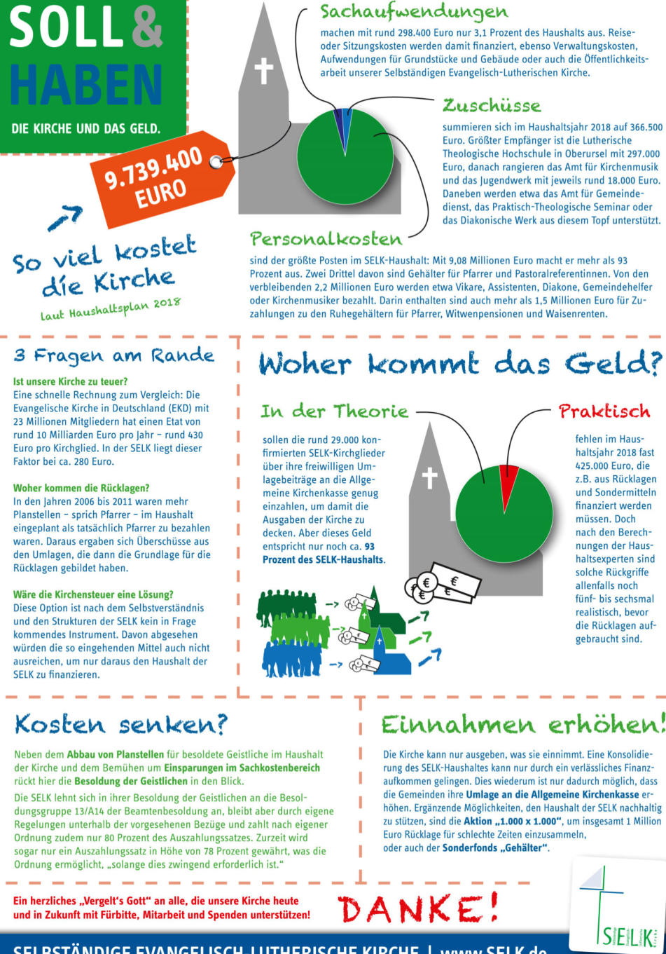 Finanzen und verantwortete Haushalterschaft Unsere Selbständige Evangelisch-Lutherische Kirche finanziert sich durch freiwillige Gaben und Spenden ihrer Gemeindeglieder. Immer wieder stellen Menschen sich die Frage: Wie hoch muss mein Kirchbeitrag sein? Jeder Christ und jede Christin ist nach biblischem Verständnis aufgefordert, nach seinen / ihren Möglichkeiten von den Gaben abzugeben, mit denen Gott ihn / sie gesegnet hat. Unsere Kirche legt deshalb keinen Maßstab fest, sondern ermuntert ihre Glieder, aus der Dankbarkeit ihres Herzens reichlich zu geben. Eine gute Richtlinie kann dennoch folgende sein: 3 % vom Bruttogehalt oder 5 % vom Nettogehalt