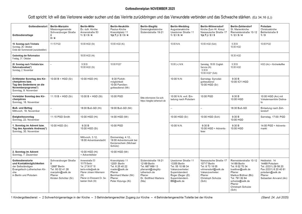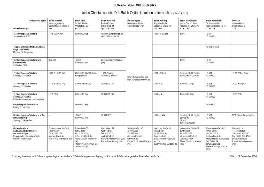 Unten finden Sie die Gottesdienstpläne für die Gemeinden in Berlin und Potsdam.Außerdem laden wir sehr herzlich ein zu:Englischen Gottesdiensten am Sa.: 11.10.2518.00Wilmersdorf01.11.2518.00 Wilmersdorf 06.12.25 18.00WilmersdorfFranzösichen Gottesdiensten am Sa.:18.10.2518.00 Neukölln22.11.25 18.00 Neukölln13.12.25 18.00 Neukölln